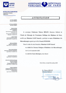 - Formation en Microchirurgie à l’École de Chirurgie de l’Assistance Publique des Hôpitaux de Paris (2023)