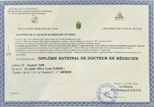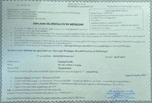 - 2024 : Diplôme de Spécialité en Chirurgie Plastique, Reconstructrice et Esthétique – Faculté de Médecine de Tunis